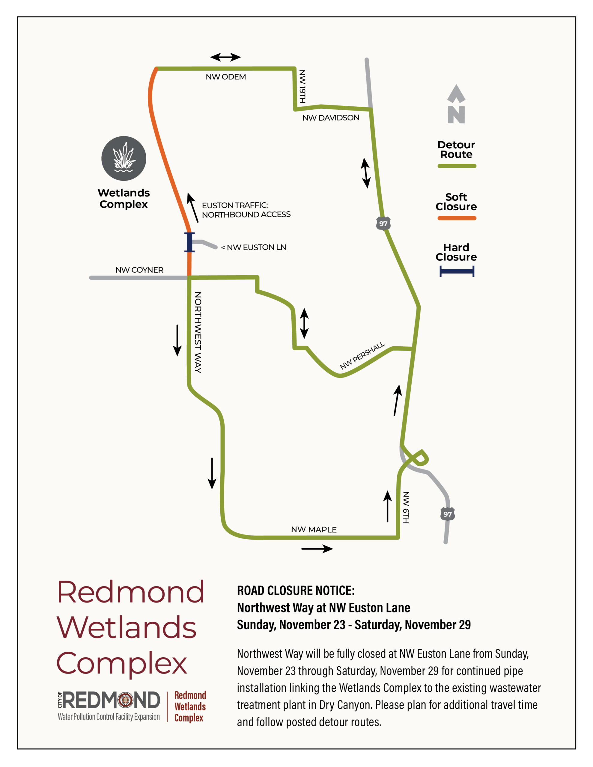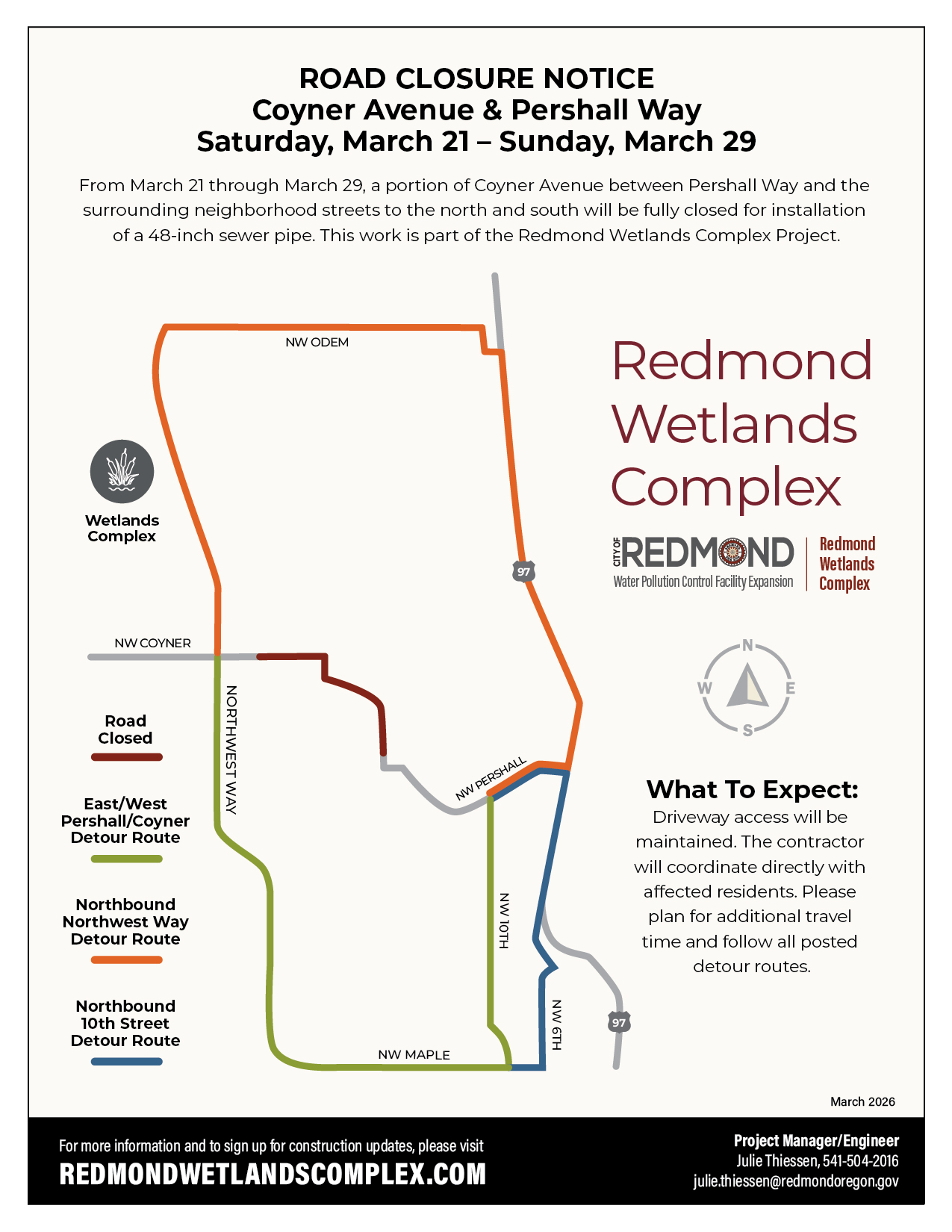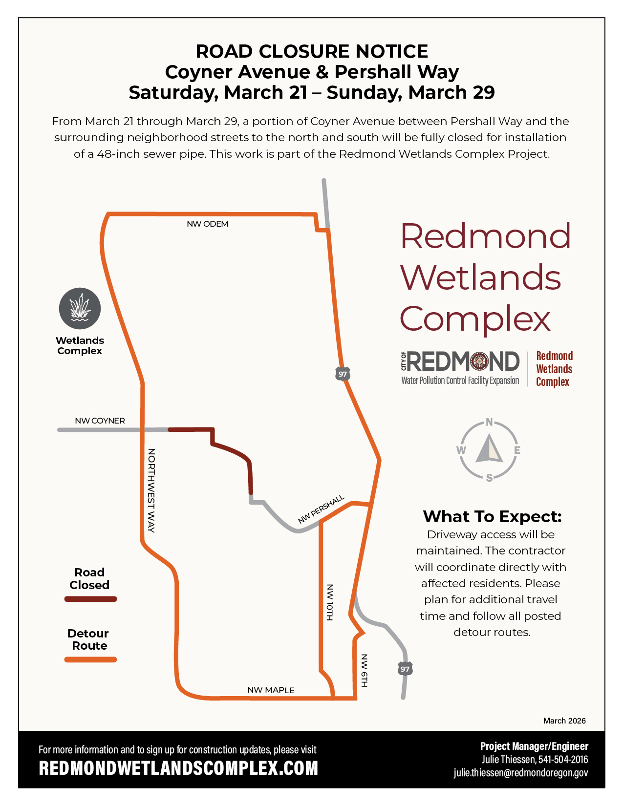 Sign up for construction-specific updates on the project website: redmondwetlandscomplex.com. Updates will be shared to keep you informed about project progress, traffic impacts, and other updates.